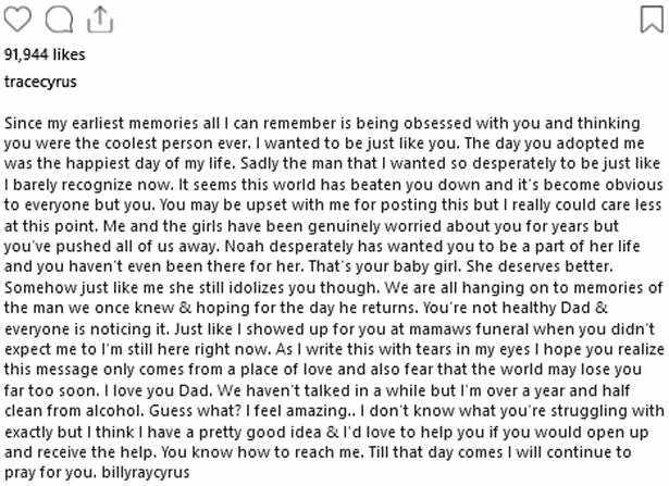 Sharing a throwback photo of them on stage, Trace wrote, “It seems this world has beaten you down, and it’s become obvious to everyone but you.” He also mentioned how his sisters, including Miley and Noah Cyrus, share his concerns, saying Billy Ray has distanced himself from the family. Trace emphasized Noah’s longing for her father’s presence in her life, calling out his absence during crucial moments.