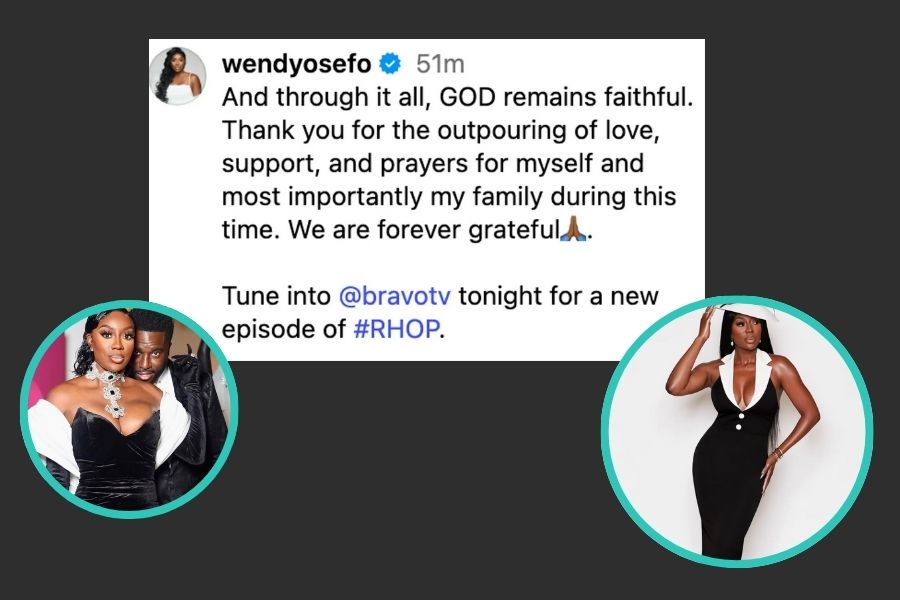 Days after she and husband Eddie Osefo were hit with multiple insurance fraud counts, Wendy returned to Instagram in a dramatic black gown, captioning her post, “And through it all, GOD remains faithful.” She thanked fans for their love and prayers, adding that her family was “forever grateful”… before plugging the next RHOP episode.