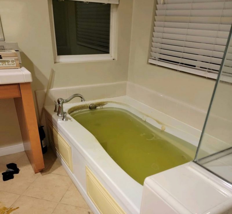There are also photos of towels on the floor and what appears to be contaminated water spilled on the bathroom tile.