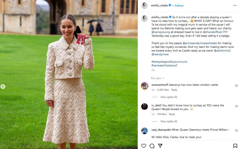 On February 22, 2024, Emilia Clarke, renowned for her role in Game of Thrones, was bestowed with the MBE honor by Prince William, Duke of Cambridge, in recognition of her outstanding charity work.