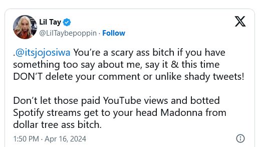 Lil Tay sparked a feud with JoJo Siwa on social media, accusing her of shady behavior and calling her derogatory names.