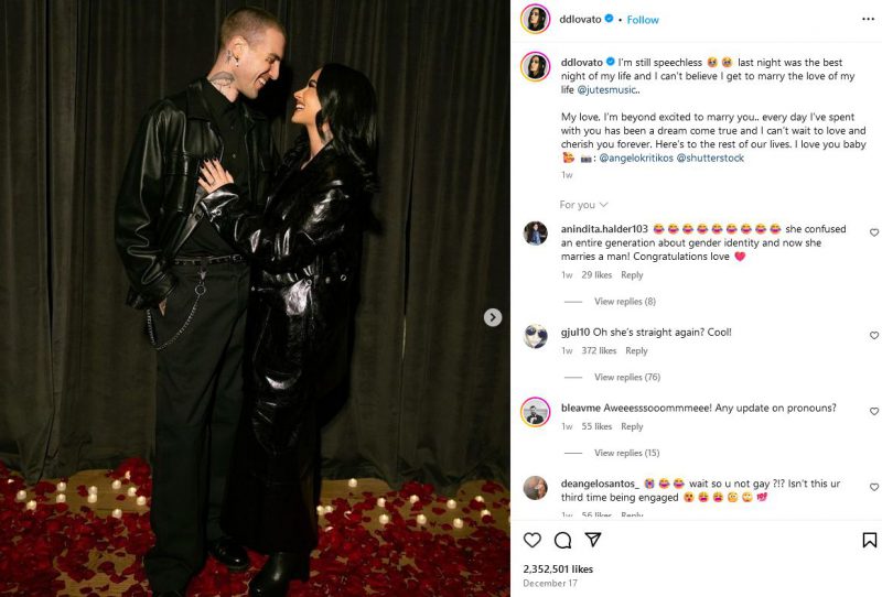 Jordan ‘Jutes’ Lutes, a 32-year-old songwriter, crafted the perfect moment, presenting Lovato with a bespoke pear-shaped diamond solitaire engagement ring from N.Y.C.’s Material Good.