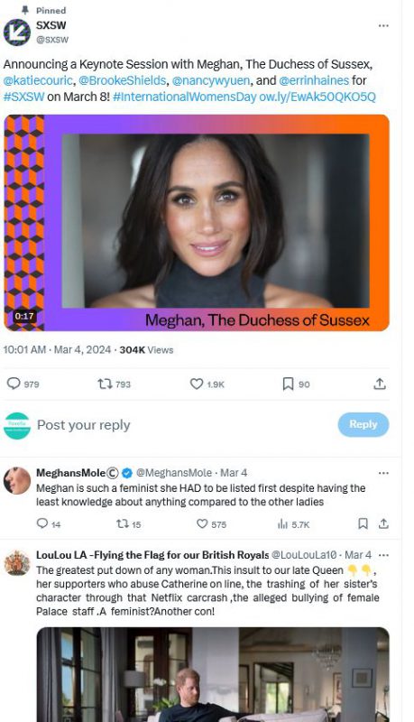 Announcing a Keynote Session with Meghan, The Duchess of Sussex, @katiecouric, @BrookeShields, @nancywyuen, and @errinhaines for #SXSW on March 8! #InternationalWomensDay https://t.co/5WlpfCU4Hl pic.twitter.com/L3UOY67vaP