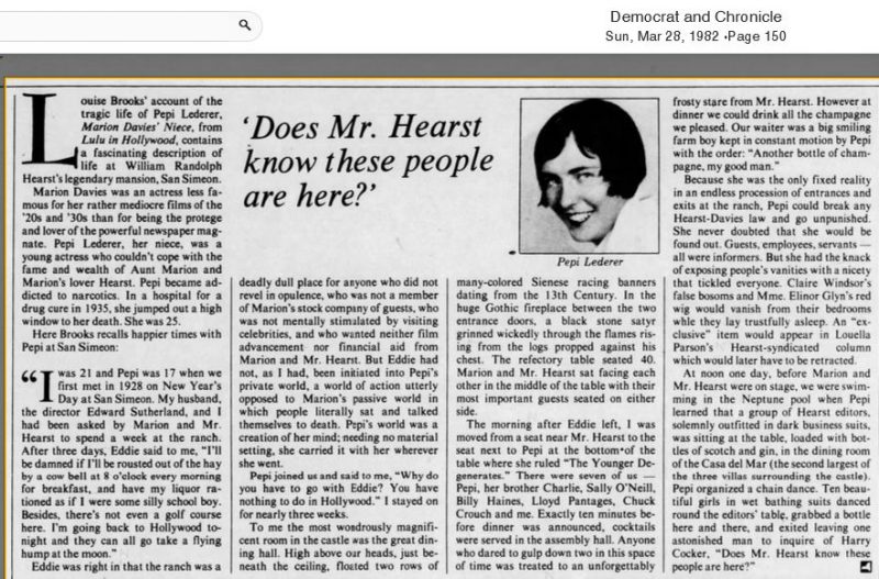 Pepi Lederer was an American actress and writer. She was the niece of actress and philanthropist Marion Davies. A high-spirited young woman, Lederer was a lesbian who had relationships with actress Nina Mae McKinney. She became a well-known figure in the gay and bisexual community of Jazz Age Hollywood